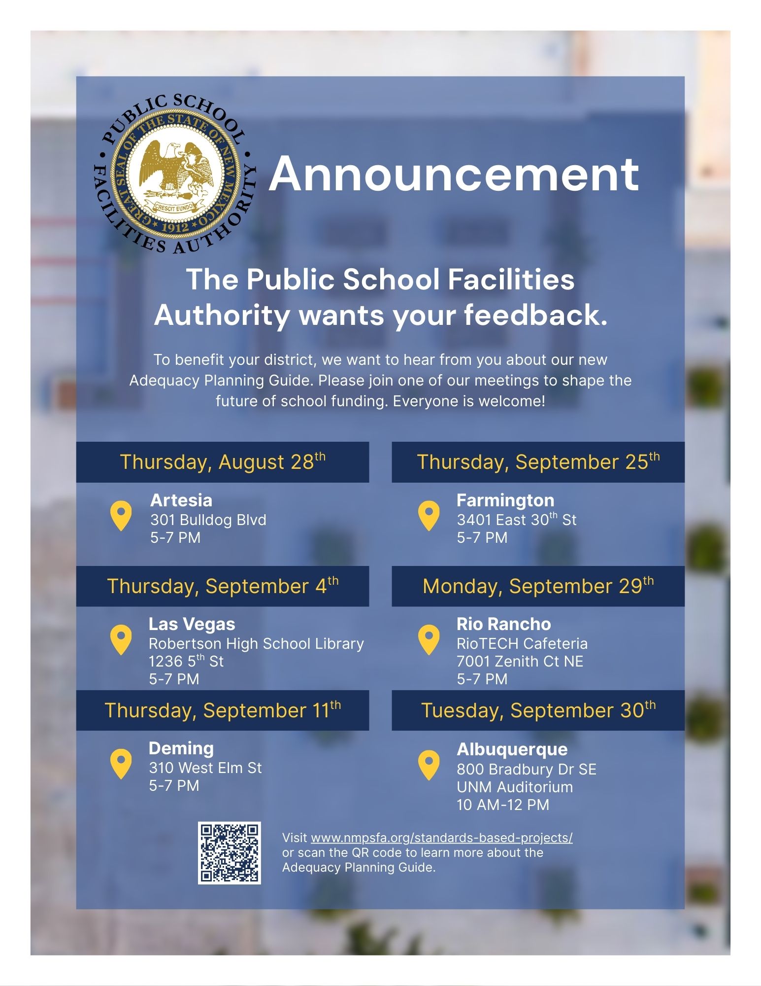 The Public School Facilities Authority wants your feedback August 22, 2025 | General Updates Versions available for download: JPG PDF